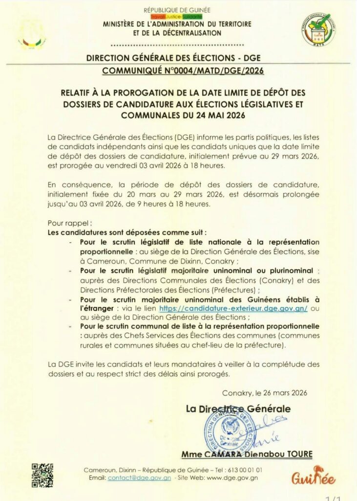 Conakry, mars 2026 À quelques semaines des élections communales prévues le 24 mai, la Direction générale des élections (DGE) a annoncé le report de la date limite de dépôt des candidatures, une décision qui marque un ajustement significatif dans le calendrier électoral en cours.